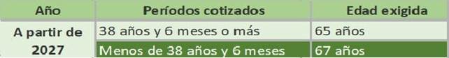 | A partir de 2027 | 38 años y 6 meses o más | 65 años |
