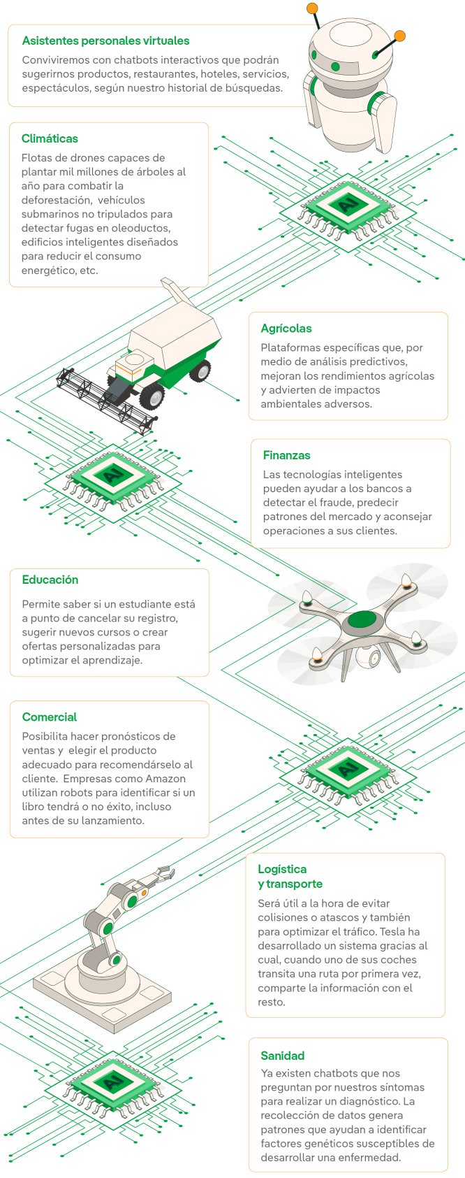 La IA está presente en la detección facial de los móviles, en los asistentes virtuales de voz como Siri de Apple, Alexa de Amazon o Cortana de Microsoft y está integrada en nuestros dispositivos cotidianos a través de bots (abreviatura de robots) o aplicaciones para móvil, tales como: LyliEnlace externo, se abre en ventana nueva., un personal shopper en versión digital; ParlaEnlace externo, se abre en ventana nueva., concebida para ayudarnos con el aprendizaje de idiomas; EmsEnlace externo, se abre en ventana nueva., diseñada para hacernos un poco más llevadera la ardua tarea de encontrar nuevo piso; o GyantEnlace externo, se abre en ventana nueva., un asistente virtual de Facebook que emite 'diagnósticos' médicos. El objetivo de todas ellas: hacer más fácil la vida de las personas.