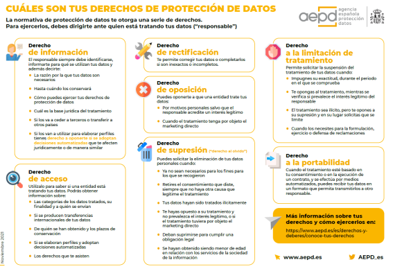 En virtud del Reglamento (UE) 2016/679, de 27 de abril, Reglamento Europeo de Protección de Datos, aplicable desde el 25 de mayo de 2018, a los tradicionales derechos de acceso, rectificación, cancelación y oposición, se suman otros nuevos: de olvido, de portabilidad de los datos, a la limitación del tratamiento y a no ser objeto de decisiones individualizadas.