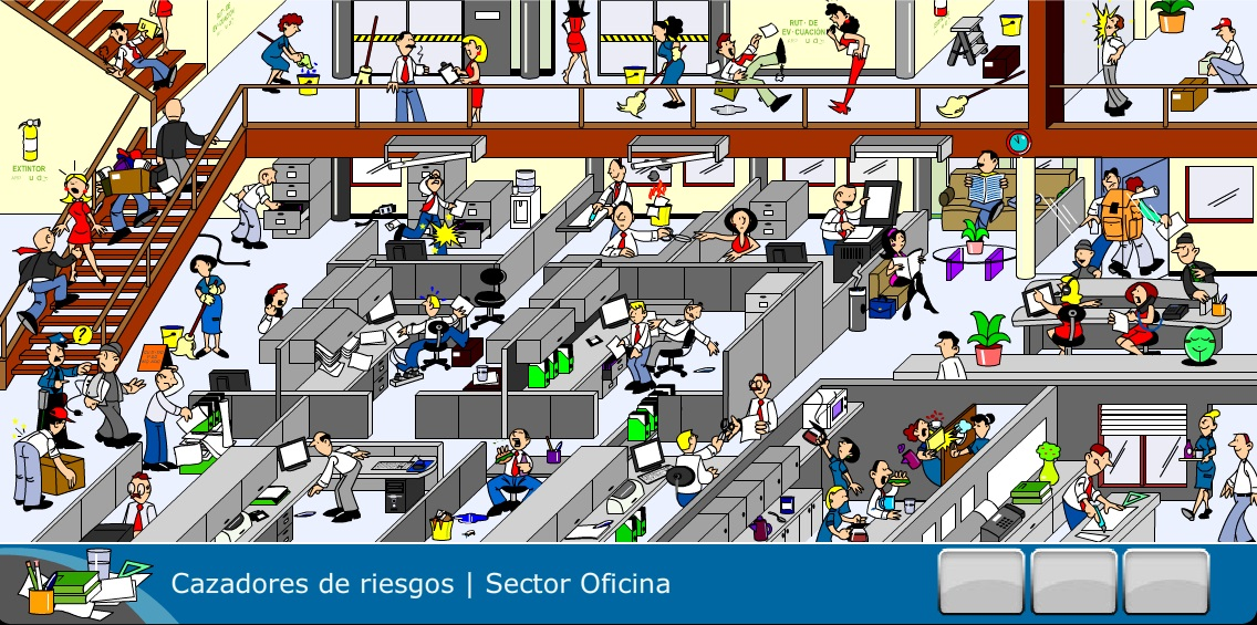 En este lugar puede golpearse con estos elementos o con los que están a su alrededor, como tropezar con el cable del teléfono, con los cajones del escritorio si no están bien cerrados, etc. Ya cuando se encuentra en lugares de paso de la oficina, se puede caer en el pasillo, resbalar a causa de pisos mojados, etc.
