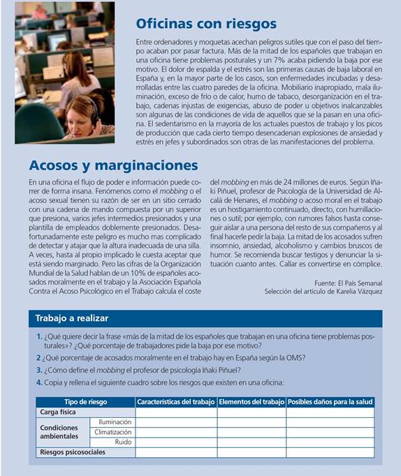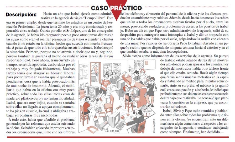 2A partir del caso práctico expuesto, tratar de identificar los factores de riesgo que están presentes en el entorno laboral de Isabel y en el de sus compañeros de oficina.