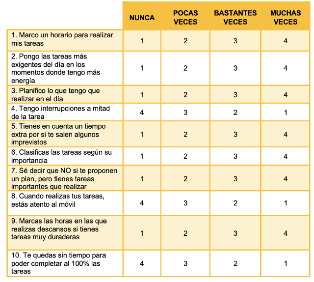 b) Suma toda la puntuación de las 10 preguntas. Si el resultado está entre 20 y 30 podemos decir que nos encontramos en la media. Si es más de 30 estaremos por encima de la media (gestionamos bien el tiempo), y si estamos por debajo de 20 estaremos debajo de la media ¿Cuál ha sido el resultado?
